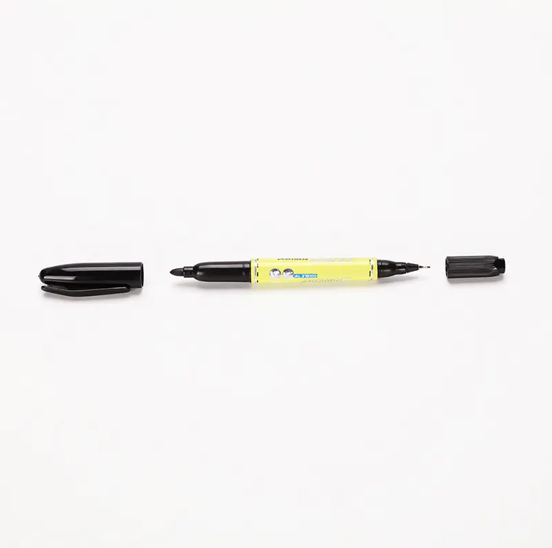 Большинство маркеров с двойным наконечником имеют широкий клиновидный или долотообразный кончик на одном конце и тонкий кончик в форме пули или иглы на другом. Они не взаимозаменяемы — они выполняют разные функции.
